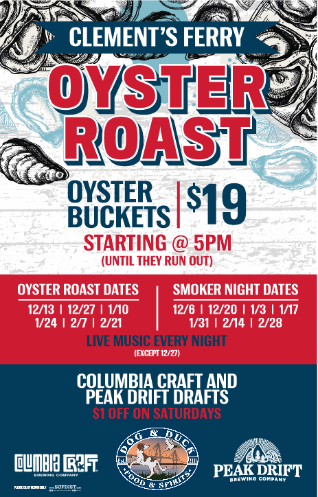 - Oyster Roast Dates: 12/13, 12/27, 1/10, 1/24, 2/7, 2/21